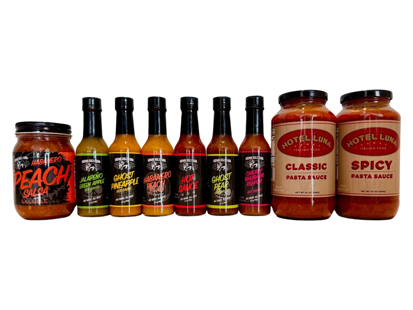 3 minis • 3 hot sauces • 1 salsa, pasta sauce, or spicy ranch • 1 merch item